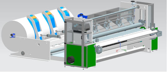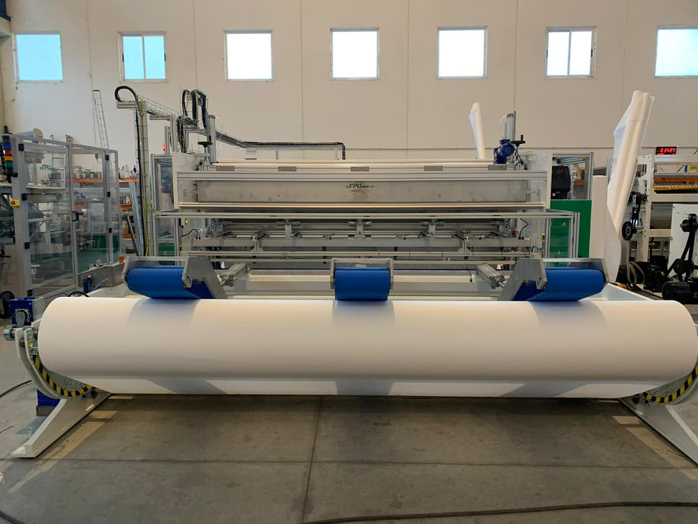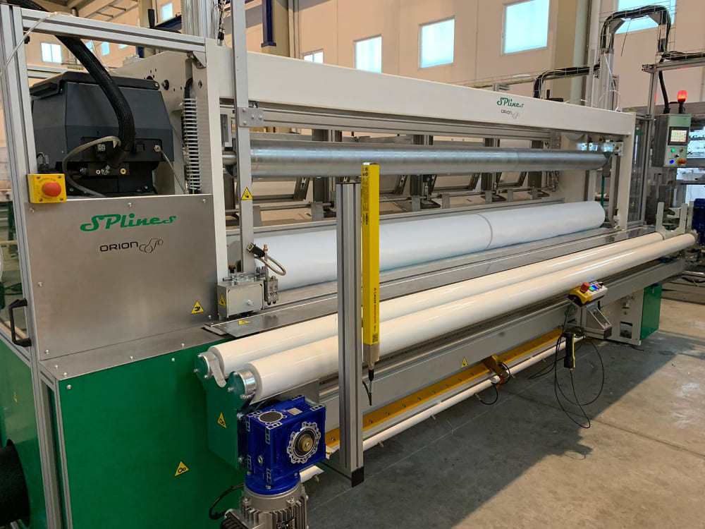 LA REBOBINADORA AUTOMÁTICA SPLINES MODELO ORIÓN 3200 para el rebobinado de rollos de grandes dimensiones. Esta máquina incluye sistema de corte longitudinal, corte transversal con aplicación de cola y extracción del rollo una vez terminado.